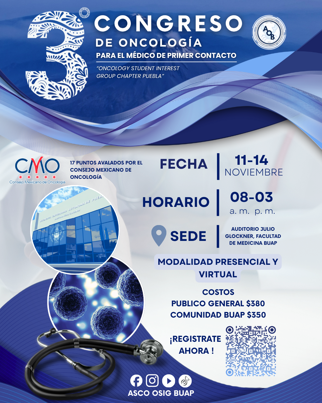 La American Society of Clinical Oncology - Oncology Student Interest Group Benemérita Universidad Autónoma de Puebla, Asociación Estudiantil de la Facultad de Medicina BUAP (ASCO - OSIG BUAP) los invita a ser parte de un evento único que reunirá a estudiantes, profesionales de la salud y especialistas en un espacio de aprendizaje, colaboración y actualización en el campo de la oncología para médicos de primer contacto.